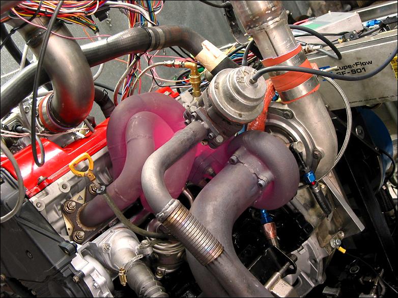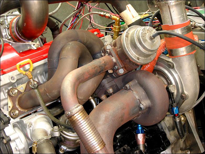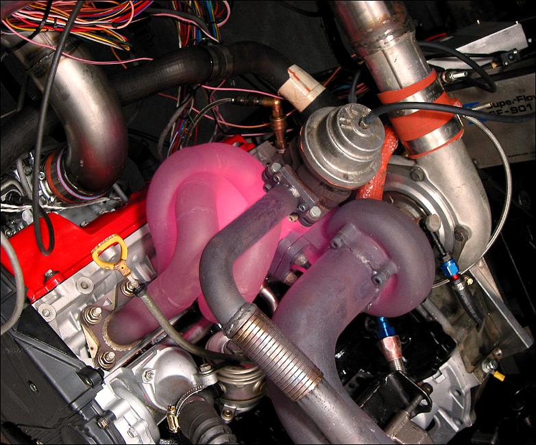 the Phil Lemm fabricated tubular manifold and HKS external wastegate