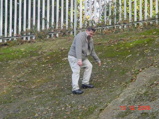 The track itself is spectacularly steep, a fact not easily grasped until you have attempted and failed to climb to the top of it as Steve kindly demonstrates here. The top section of the banking must be approaching a 40 degree slope!