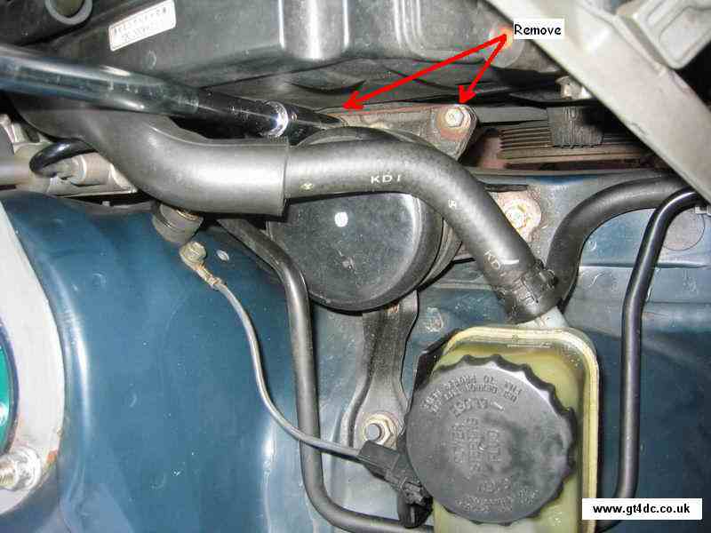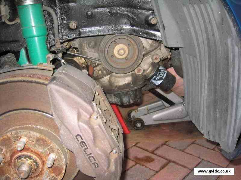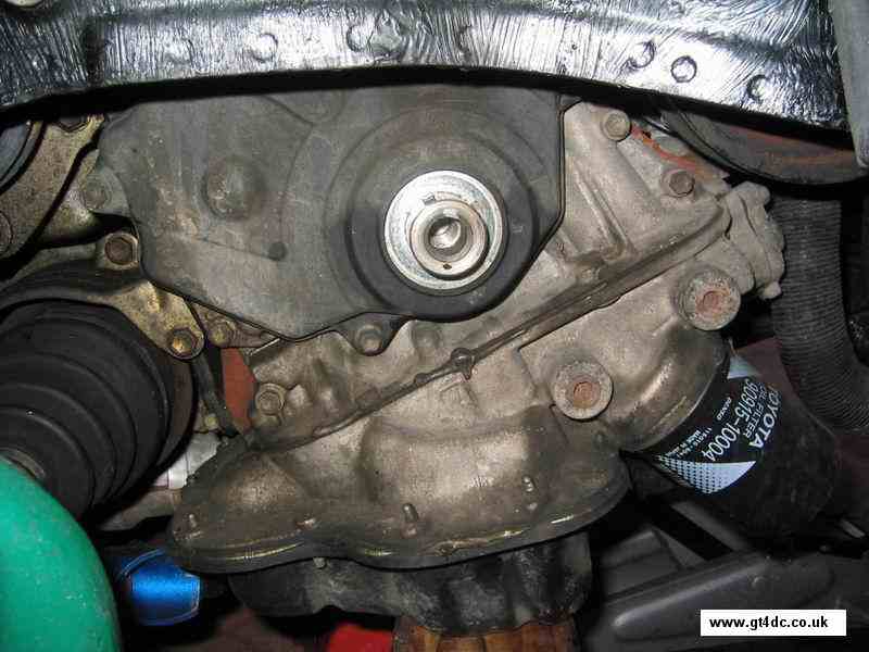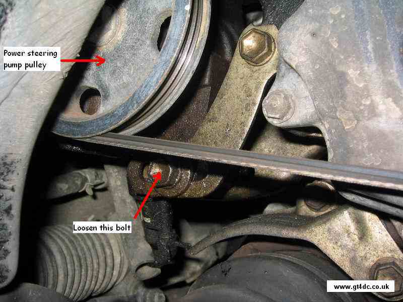 The power steering belt requires removal before the crank pulley is removed. Either cut this off or, slacken the tensioning bolt and swing the pump towards the front of the car - note every belt I have done has been stiff to move and requires some "persuasion"! |