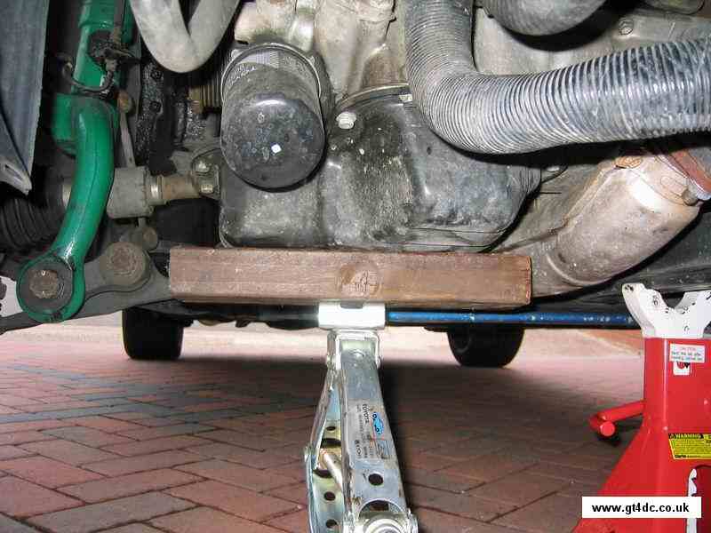 Place a nice thick piece of wood under the black sump as shown. The wood is here to spread the load across the sump and prevent any nasty damage. Adjust the jack to take the weight of the engine so that when the drivers side engine mount is released the engine does not go anywhere. This is also useful to jack the engine up and down to gain a little better access to the cambelt top cover bolts etc |