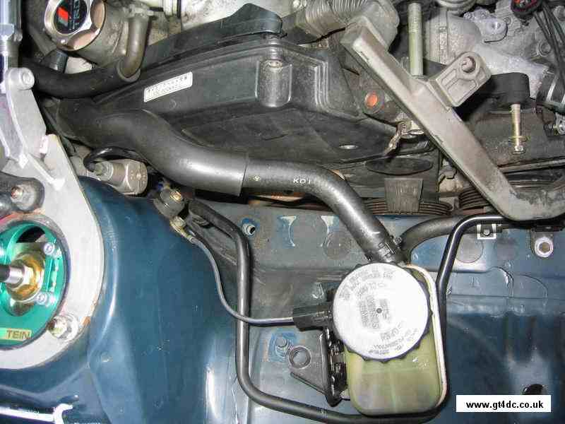 Undo the lower hose from the power steering reservoir and drain the ATF from the hose and reservoir and dispose of the old fluid. Then, remove the reservoir completely - I also covered the ends of the hoses to prevent ingress of crap! |