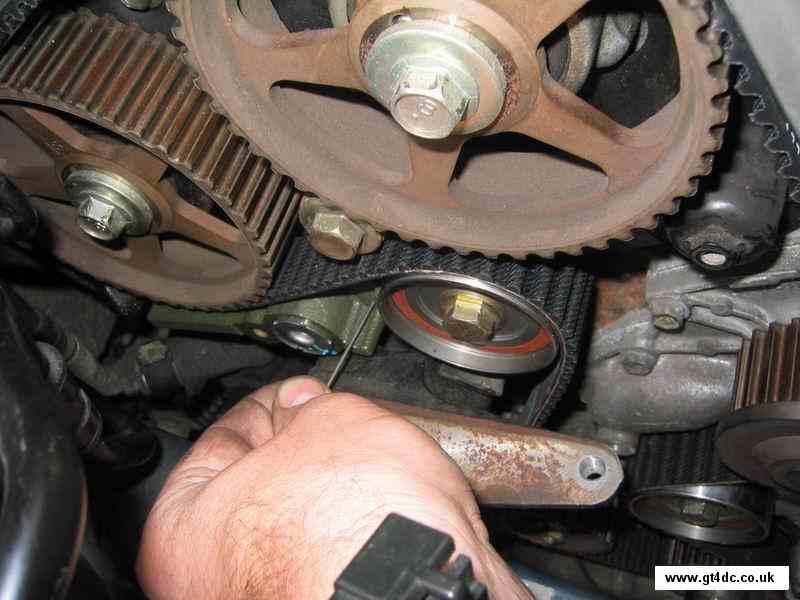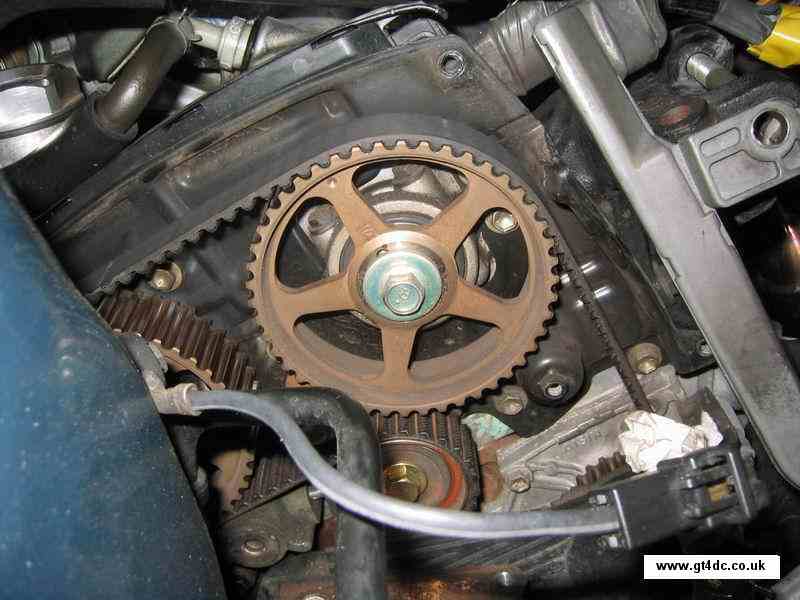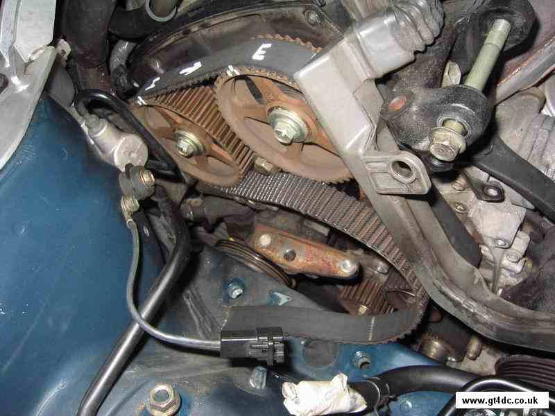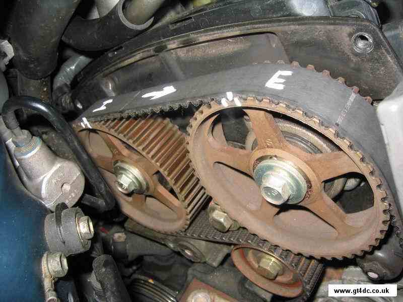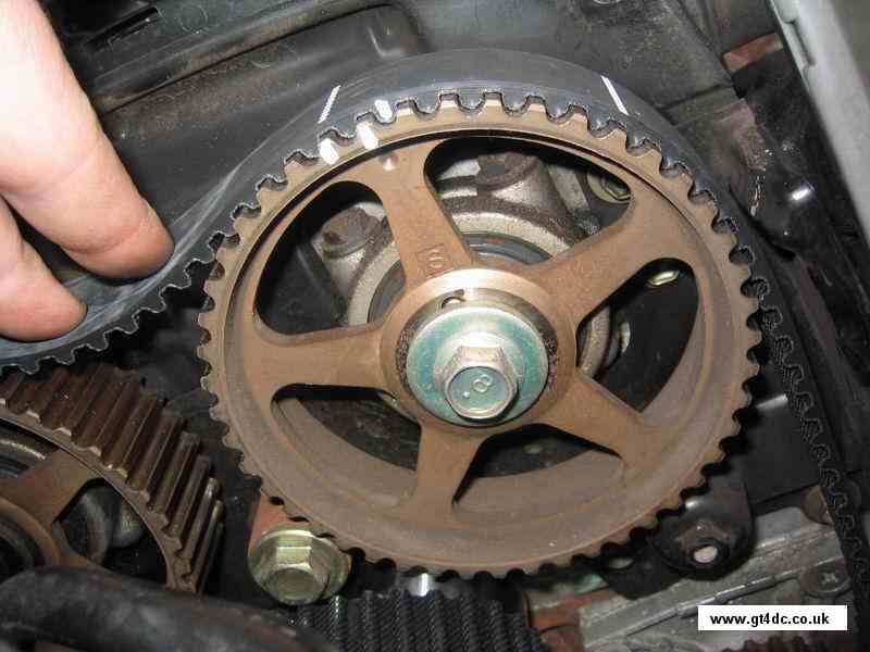 Simply pull the timing belt free from around all the pulleys and sprockets. Note that the camshaft sprockets WILL move due to the tension of the valve springs and the belt, do not panic, you have the original positions marked on the belt you are removing! |