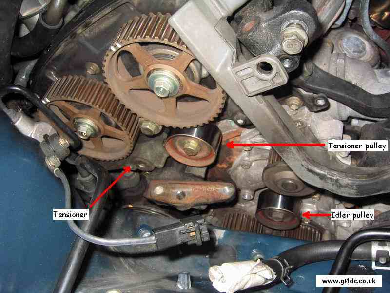 Before refitting of a new belt the old worn components need to be replaced. Indicated are the Tensioner, Tensioner pulley and idler pulley.