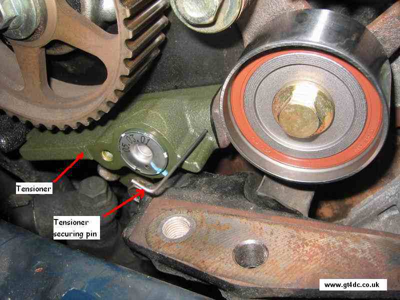 Tensioner plunger back into the Tensioner assembly. This is a fairly slow process to push the Tensioner plunger back into the housing, but as this plunger moves back you should reach a point whereby you can re-insert the pin - you should now have some slack back in the timing belt. If you have lost the pin you can put in a 1.2mm Allen key or a little smaller in order to keep the plunger held back.