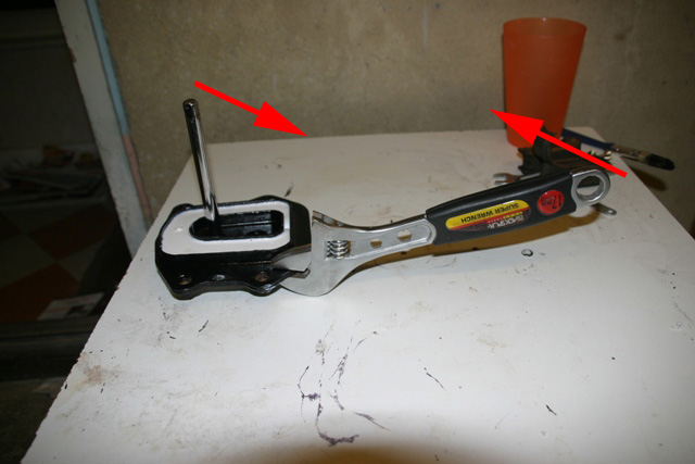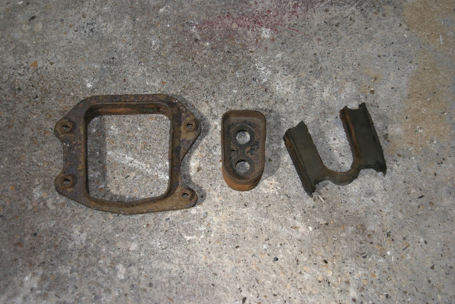 Using a prybar (I found a 3/8" socket extension bar to be about right) lever the central metal section from the outer frame. I did this by sticking the prybar through one of the two differential bolt holes and twisting the centre while holding the outer frame rigid with an adjustable. NB the photo here shows the completed mount as I forgot to take one of the original |