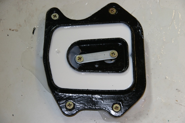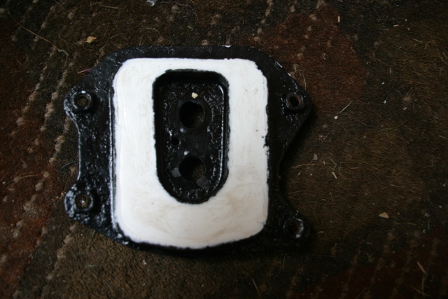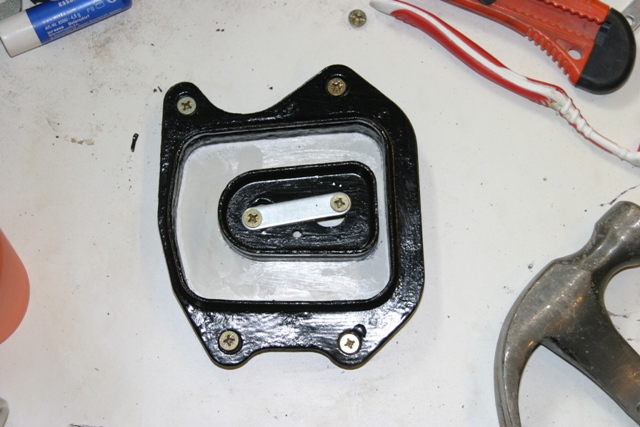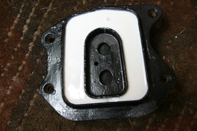 Here is where I made a bit of a mistake. I used a little extra grease round the outline of both metal bits hoping that this would form a seal between the metal and the board when everything was screwed down. This proved not to be the case and I suffered some leakage in the next step. I think this is where my improved method would work but, again, as I have not tried it I have not described it. |